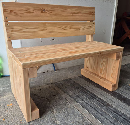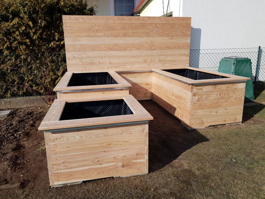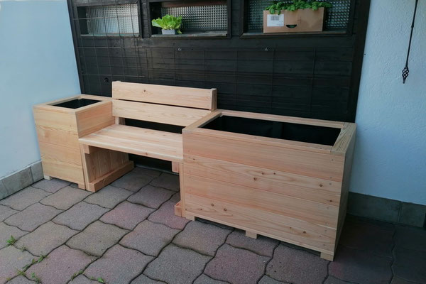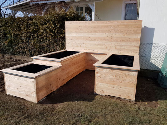 Diese Gartensitzbank aus massivem Lärchenholz mit zwei großen Pflanzentrögen an beiden Seiten wurde individuell auf Wunsch des Kunden gefertigt.